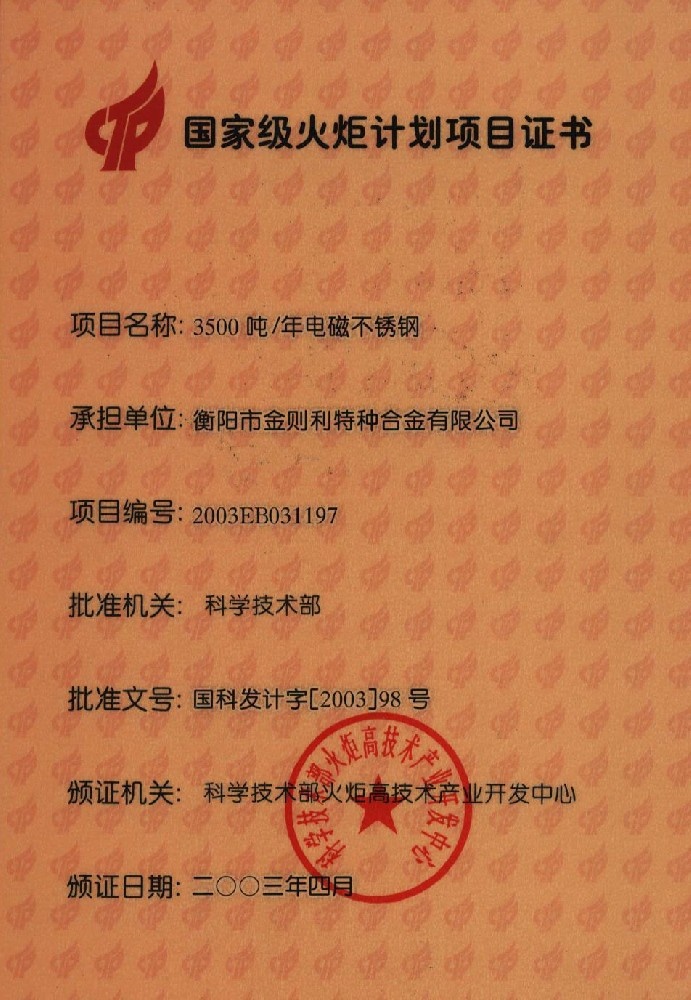 國家級火炬計劃項目證書 |